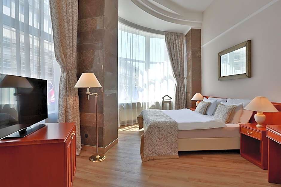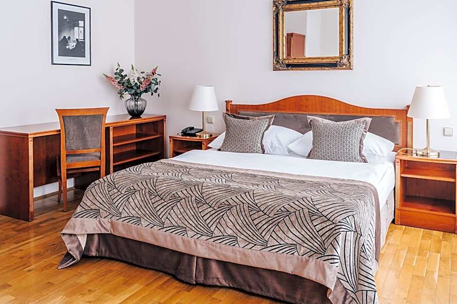 Elegantly equipped room with satellite TV, a mini-bar and a bathroom with a bathtub or a shower.